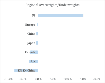 At a high level, we retain an overweight position in US equities, the majority of which is “funded” by an underweight to Emerging Markets Ex-China (we have a roughly market weight position in Chinese stocks). In terms of sector exposure, our key overweight remains to Information Technology (the Financials overweight is skewed by Berkshire Hathaway, which MSCI classifies as a Financial, but is in fact has a broader exposure), while we also retain a modest overweight to Consumer Discretionary via investments in companies such as Home Depot and LVMH. Our underweights are mainly in more defensive sectors such as Consumer Staples, Utilities, and Healthcare.