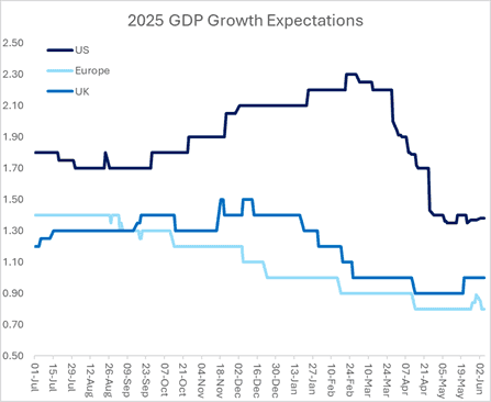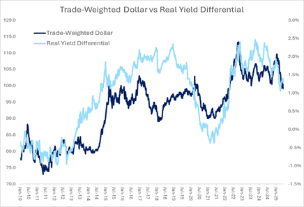 Equities are down around 4% on the month and have drawn down around 6% from their highs now. US stocks have underperformed, while economically sensitive sectors have seen relatively more selling. The selloff has been driven by uncertainty around tariffs, with the blanket tariffs introduced by President Trump being met by reciprocal tariffs from China and other countries. The fear is that a trade war will negatively impact already fragile consumer sentiment and trigger a growth slowdown or even a recession.