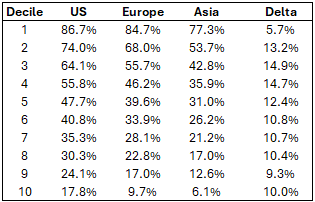 The simple interpretation of this is that decile 1 gives you the top 10% of companies in each region by gross margin, and tells you the average gross margin of companies in that bracket, i.e. 86.7% for decile 1 in the US tells you that the top 10% of companies in the US by gross margin make an average gross margin of 86.7%, while for Asian companies, the elite top decile group makes an average gross margin of 77.3%. What is interesting about the table is that again we see that the US dominates Europe and Asia, meaning that across each decile, US companies tend to be considerably more profitable (at the gross margin level) than their peers. The Mag7 have certainly contributed to better US corporate performance, but it seems clear to us that something more widespread is going on here, and this has meant that the rest of the world has been happy to own US companies, and to buy USD to support those purchases.