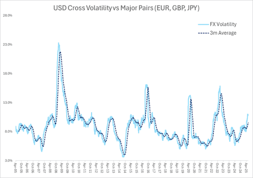 Finally, we’d note that all of the changing dynamics that we’ve noted this year have resulted in increasing volatility in the daily moves of the dollar. In the left-hand chart below, we plot the standard deviation of daily moves in USD relative to EUR, GBP, and JPY, and note that there has been a meaningful pickup, more or less since the Trump election win. What’s interesting about the increase in volatility is that holders of USD-denominated assets have often been willing to hold these assets unhedged, i.e. a Taiwanese insurance company reporting in TWD might hold US treasuries and not hedge out the risk of the USD depreciating against the TWD, which would inflict a loss on the insurer. We find this lack of hedging to be the case more often in the case of holdings in equities, however it also appears to be a feature (to a lesser extent) with regards to bond holdings (see bottom right chart). Looking at why foreign holders of USD-denominated assets might be willing to assume the currency risk associated with those assets, firstly there’s a cost to hedge, but probably equally important has been the fact that, until recently, the dollar has been strong, so not hedging has been a tailwind for returns. Looking at what’s changed recently, given that there is discussion in the market around the sustainability of US deficits, the seemingly erratic nature of US policymaking, and, on a more prosaic note, more day-to-day volatility, one might reasonably expect that foreign holders of USD-denominated assets might be having high-level discussions on the prudence of running unhedged exposures. Given the sheer scale of foreign holdings of US assets, even a 1% increase in the overall share of those holdings that are FX-hedged might represent a meaningful amount of selling pressure on the dollar. Accessing good, real-time data on hedge ratios is challenging, so it’s hard to draw any concrete conclusions, but it’s nevertheless an interesting point to reflect on.