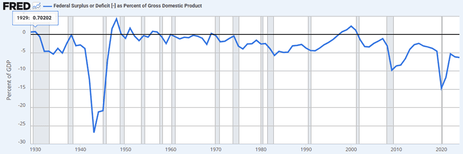 Fig 8: US Federal surplus/deficit relative to GDP; Source: St Louis Fed