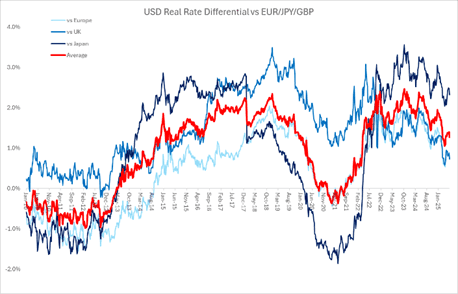 Next, the real yield advantage that US bonds enjoy relative to their peers in Europe, Japan and the UK has been shrinking. The yield advantage peaked in the summer of 2023 and has since been compressing (see chart below):