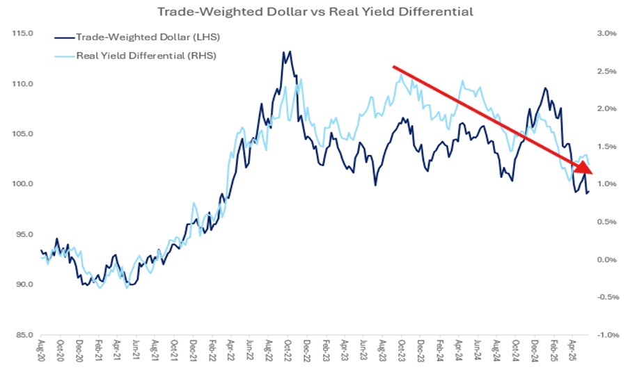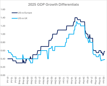In the first chart, we simply chart estimates by region, while in the second, we look at the growth in the US minus the growth in the other regions to show the growth premium the US enjoys. What is noticeable on the two lines in the right-hand chart is that, while the US is still expected to grow more quickly relative to either Europe or the UK in 2025, that difference is expected to be modest (40bps-60bps), and expectations for the US relative to other regions have been compressing since the early part of 2025, with the compression accelerating over the course of the Liberation Day. In terms of understanding why the “US Growth Premium” is shrinking, from the US side, the market appears to be taking the view that nobody wins from tariffs, but the US loses more. This has driven most of the compression, in our view. What’s particularly interesting is that, as President Trump’s economic advisors no doubt informed him before Liberation Day, Economics 101 teaches that, all other things being equal, higher tariffs ought to lead to USD strengthening (indeed this is what we saw on the first iteration of tariffs over President Trump’s first term), however in 2025 we’re seeing the opposite in terms of the move in the dollar, with more pessimistic US growth expectations possibly playing some role in the differing currency behaviour.