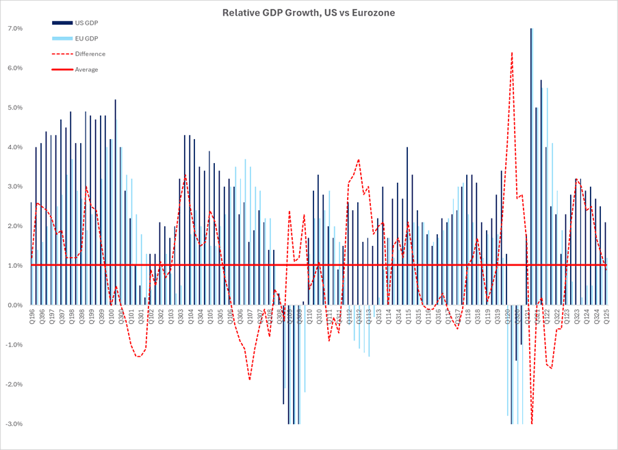 Examining these bull points in turn, first we turn to relative GDP growth rates. The US has long been perceived as a more dynamic economy relative to Europe or Japan due to more easily available capital, greater flexibility in labour markets and better productivity growth, among other reasons. Looking at the data, while the drivers could be the subject of another (long) article, the evidence is quite clear. In the chart below, we compare the YoY growth in GDP in the US and the Eurozone using quarterly data since the mid-90’s – the quarterly differences are the dotted red line, while the long-term average difference is the solid red line. On average, the US economy has grown roughly 1% more quickly (2.5% vs 1.5%) per annum than the Eurozone economy: