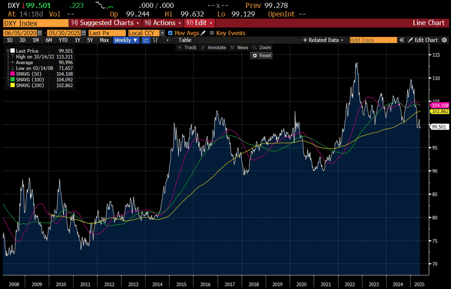 The exact dynamics of when government debt becomes a problem and how to time investments around that is notoriously tricky (the 2011 book “This Time Is Different” by Reinhart & Rogoff is an interesting read on the topic, for those interested), however we think that, alongside the more general attempt by the market to contemplate the risks around the dollar’s “reserve currency” status being at risk, this gradually worsening debt dynamic has been on the back of investors’ minds. More recently, the “Big Beautiful Bill” announced in the US, which many commentators believe will worsen debt dynamics overall, has probably not been helpful in this regard.