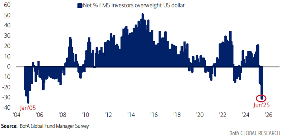 With that being said, further dollar weakness is by no means a given. Over the short-term, we note that sentiment on the dollar is very negative and very one way. In the chart below, we summarise the most recent findings from the Bank of America Merrill Lynch investor sentiment survey, where institutional investors are asked for the opinions and positioning in respect to various macroeconomic and strategic factors (typically which regions and sectors they are bullish and bearish on, which currencies and commodities they are bullish and bearish on, and so on). In the most recent survey, the findings on the dollar were that bearish bets are as negative as they’ve been in about 20 years. While we’re not advocating reflexively taking the other side of any consensus view, often it pays to look at the other side of the argument.